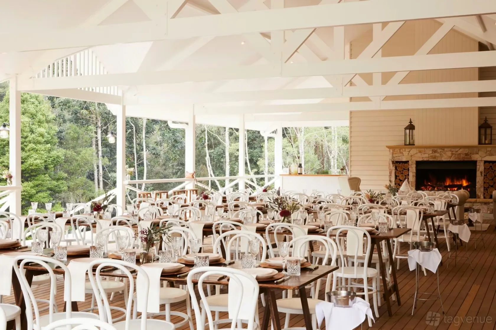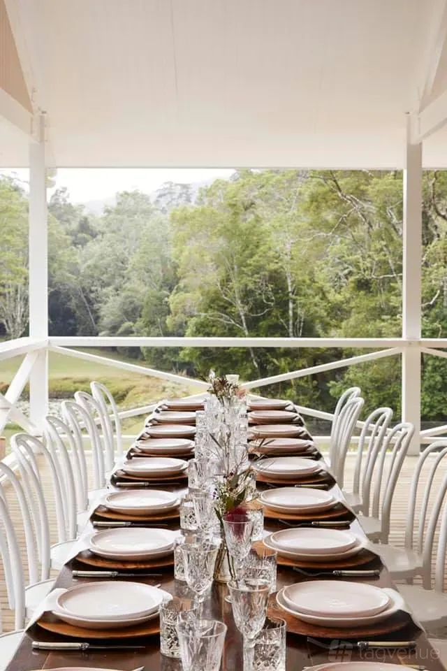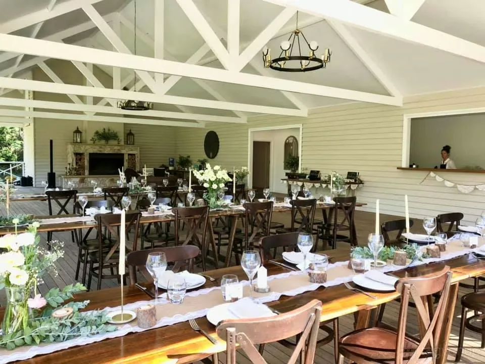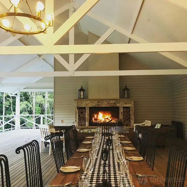 The Argory is a country-chic function space surrounded by lush rainforest and lawns. The covered deck, with vaulted ceilings and stone fireplace, overlooks the lily ponds providing an all-weather space for your special event. The venue also includes a bar and kitchen as well as bathrooms and shower rooms.