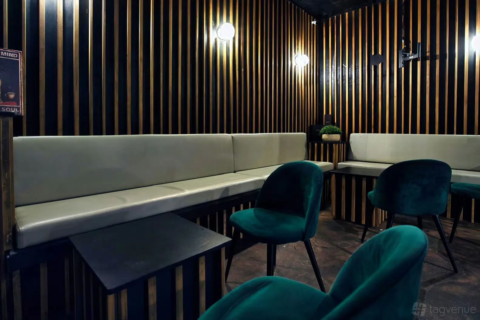 A modern main bar, comfortable lounge spots, open group areas, and a secluded outdoor courtyard are part of the space. The combination of indoor and outdoor environments provides a close, adaptable setting for various event types.