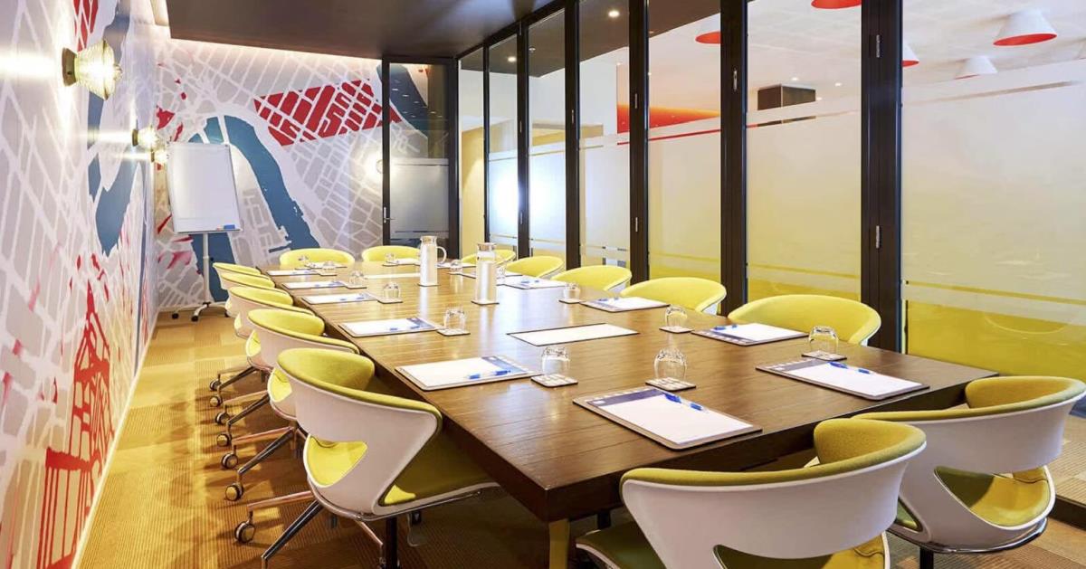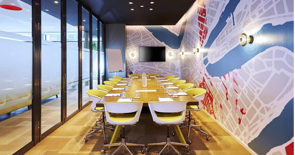 The meeting room typically includes audio-visual equipment, presentation screens, high-speed Wi-Fi, and basic technical support to assist with events.