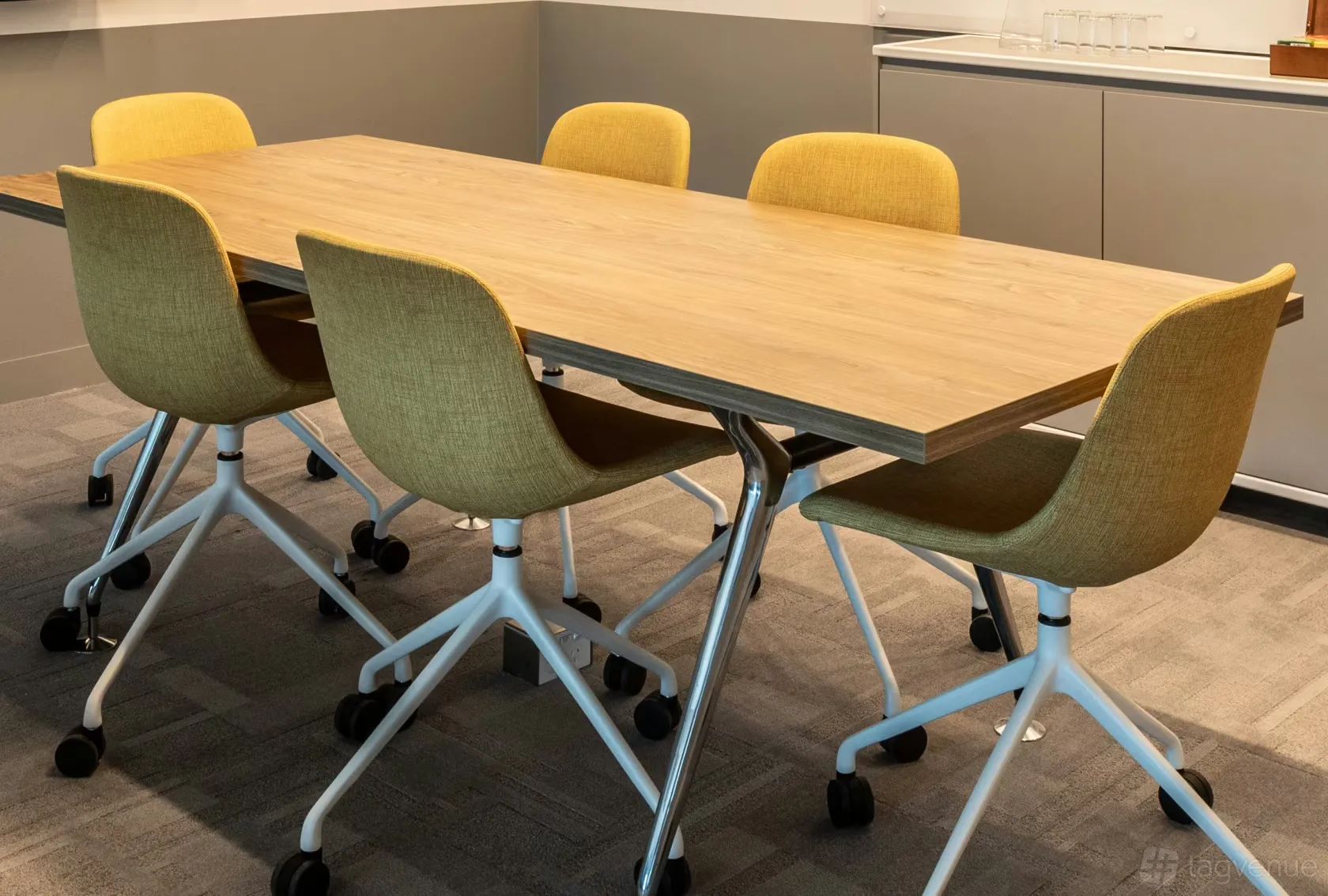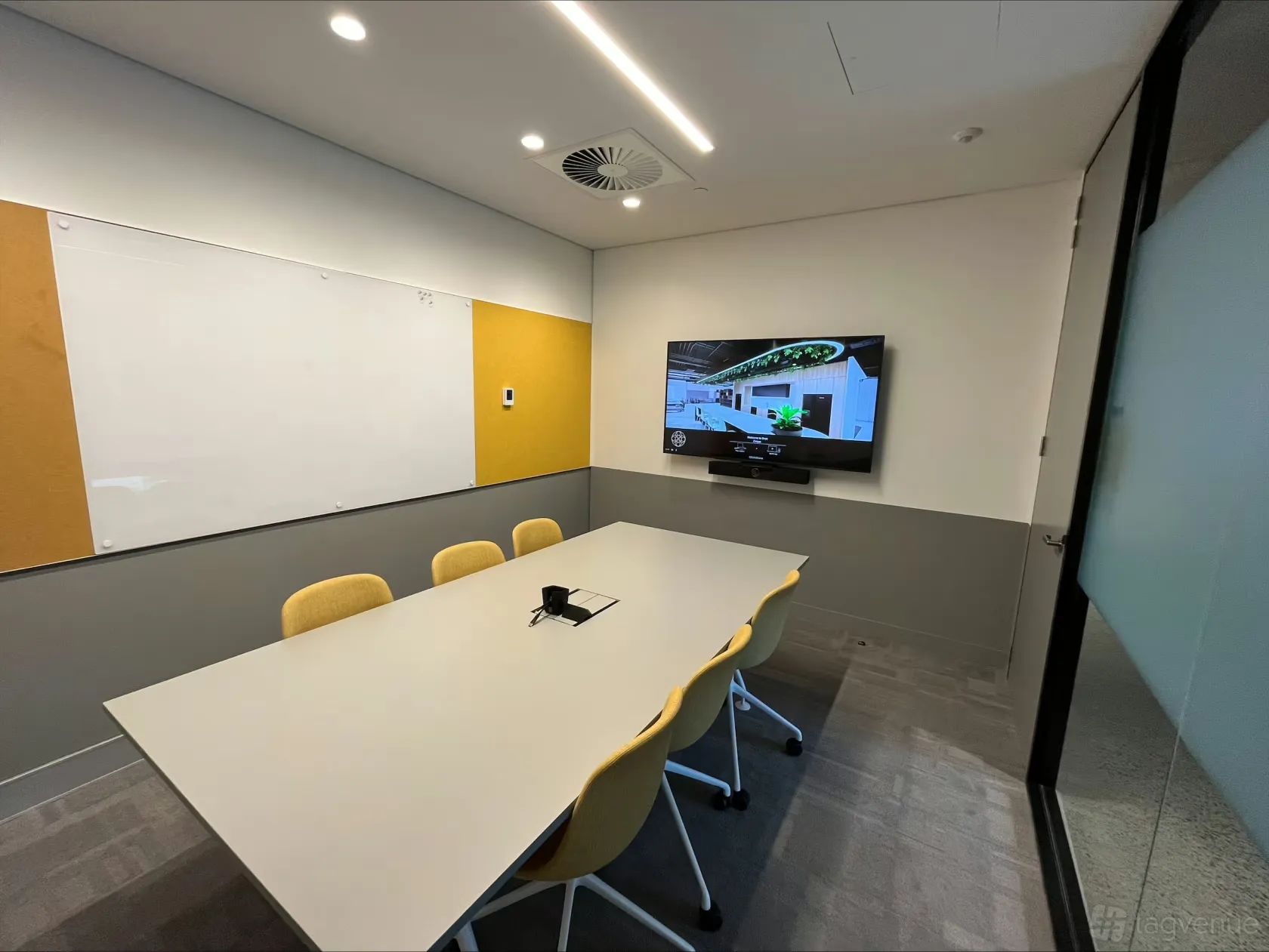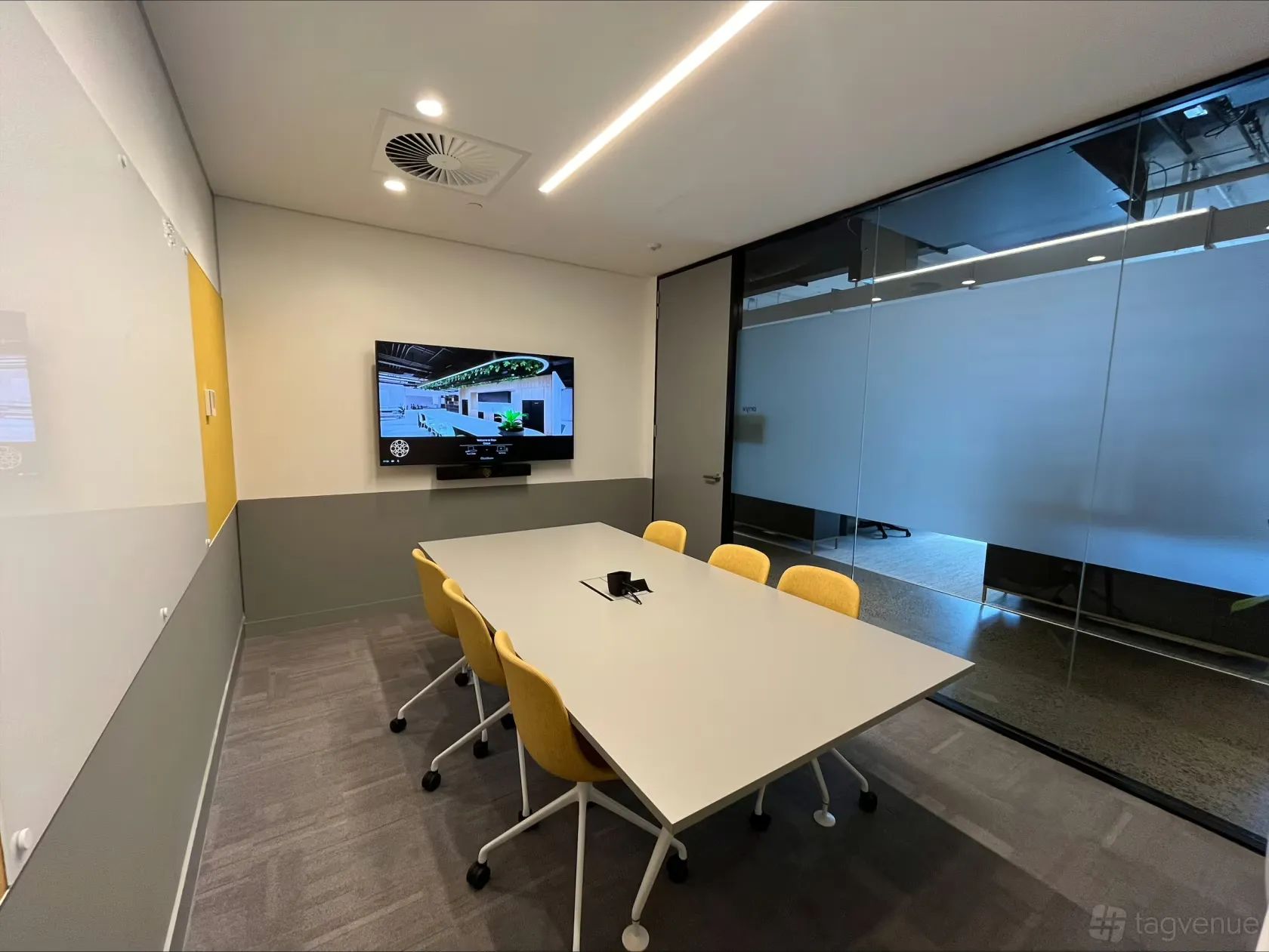 Our six-person boardroom is a sleek, modern design which creates a professional and productive environment. Comfortable seating and ample natural light provide a welcome and relaxed atmosphere. The room features wireless connection to the high definition TV with built in audio and video conferencing.