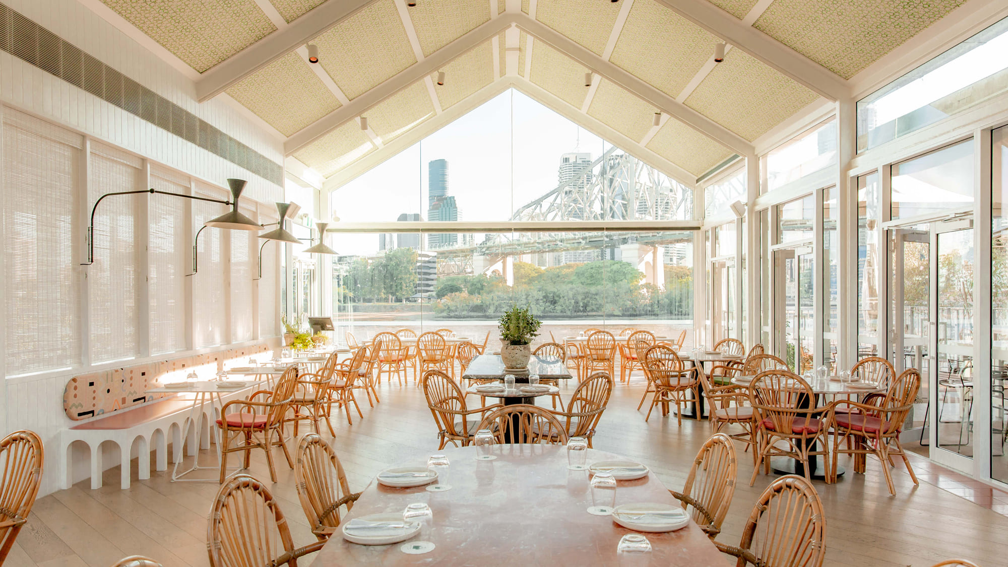 The Long Gallery is a unique and versatile event space with its towering ceiling and impressive display of contemporary art. The Sue and Brian King River Room, situated at the end of the Long Gallery, features floor to ceiling glass windows which provide striking